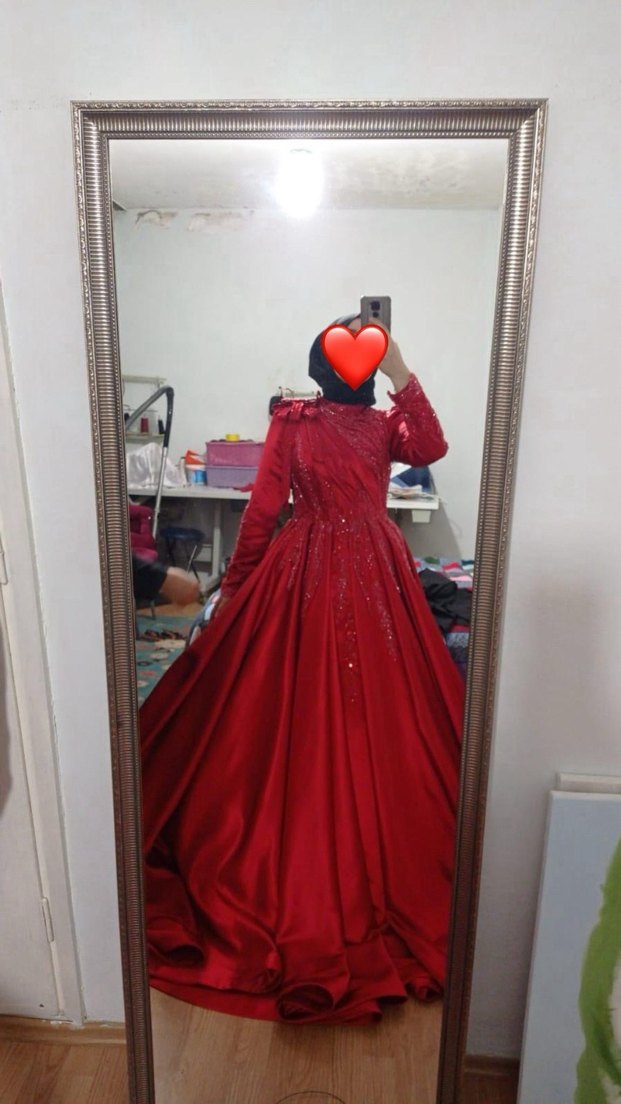 Parlak kırmızı, uzun kollu ve yüksek yakalı nişan elbisesi. Drapeli ve desenli kumaşıyla modest ve gösterişli bir tarz sunar. Özel dikim arkası ipli tarlayan hediyeli omuzundaki kurdele detayı tak çıkar