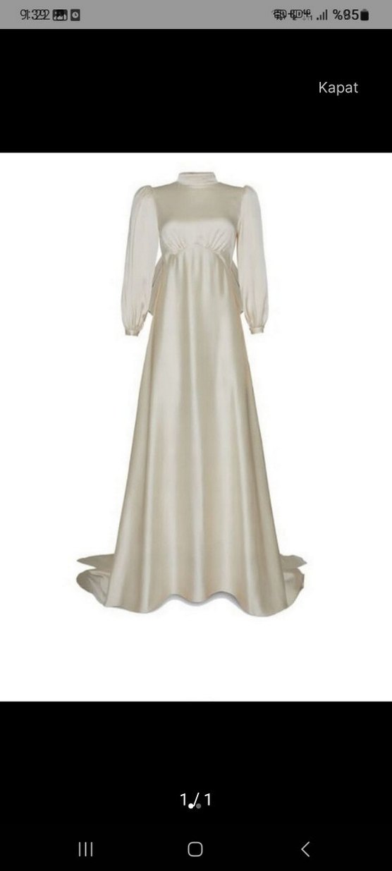 Uzun boylu beyaz gelinlik, yüksek yaka ve uzun kollu detaylarla modern klasik ve vintage tarzı bir araya getiriyor. A kesim ve regular fit ile klasik zarafet sunar.