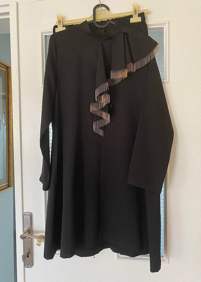 Çok severek kullandım hiçbir sorunu yoktur yakasındaki zincirleri ben ekledim isterseniz çıkartabilirsiniz double krep çok şık kaliteli bir üründür 38-40 beden uyumlu. Pantolon boyu 90 cm. Basen 55 cm. İki kol arası 50 cm. Kol boyu 58 cm tunik boyu 86 cm