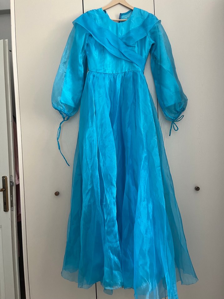 Uzun, parlak mavi renkli, drapeli ve bol kesimli bu elbise, tekne yaka ve askılı kollara sahiptir. Vintage bohem tarzda, düğün için uygundur.
