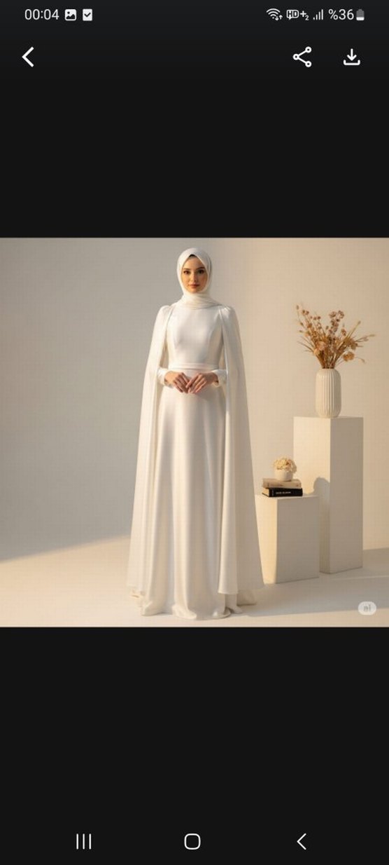 Uzun beyaz elbise, yüksek yaka ve uzun kollu, drapeli tasarımıyla sade ve tesettürlü bir görünüm sunar. Düz kumaş, düzenli kesim ve düğünler için uygundur.