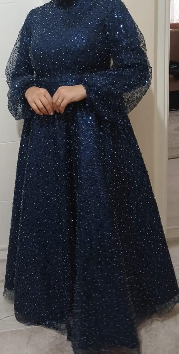 Uzun, bol kesim abiye elbise, uzun kollu, parlak lacivert tül detaylı. Bir kez nişanda giyildi. 38 benden ama 40 beden giyene de uyumlu.
