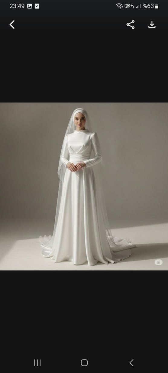 Uzun beyaz gelinlik, drapeli tasarımı, yüksek yakası ve uzun kollarıyla modern klasik ve tesettür şıklığı sunar.