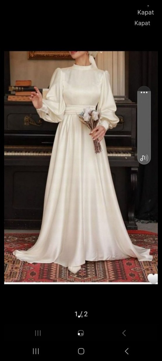 Yüksek yakalı, uzun kollu ve bol kesimli uzun beyaz bir elbisedir. Drapeli tasarımı klasik zarafeti ve vintage dokunuşu yansıtır, düğünler için uygundur.