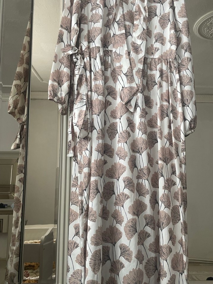 Bej renkli, çiçek desenli uzun elbise, bol kesim ve drapeli tasarıma sahiptir. Askılı kollu ve straplez yakalıdır, bohem tarzı için uygundur.