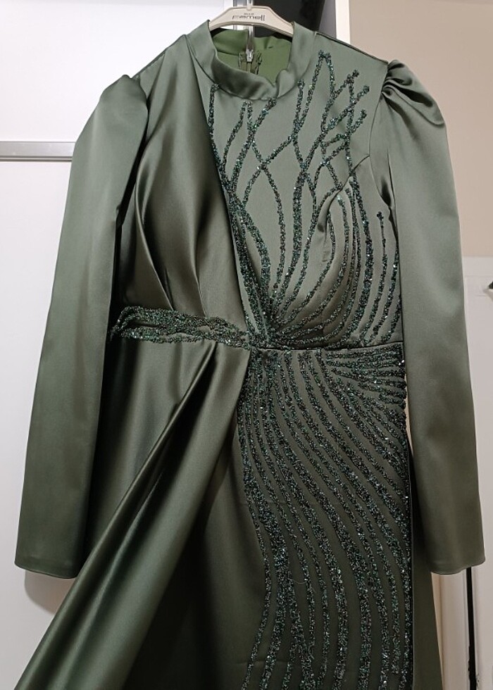 Haki yeşili saten elbise. 1 kere giyildi. 44 beden. Kaliteli kumaş taşlı ağırdır. Pazarlık yapılır.