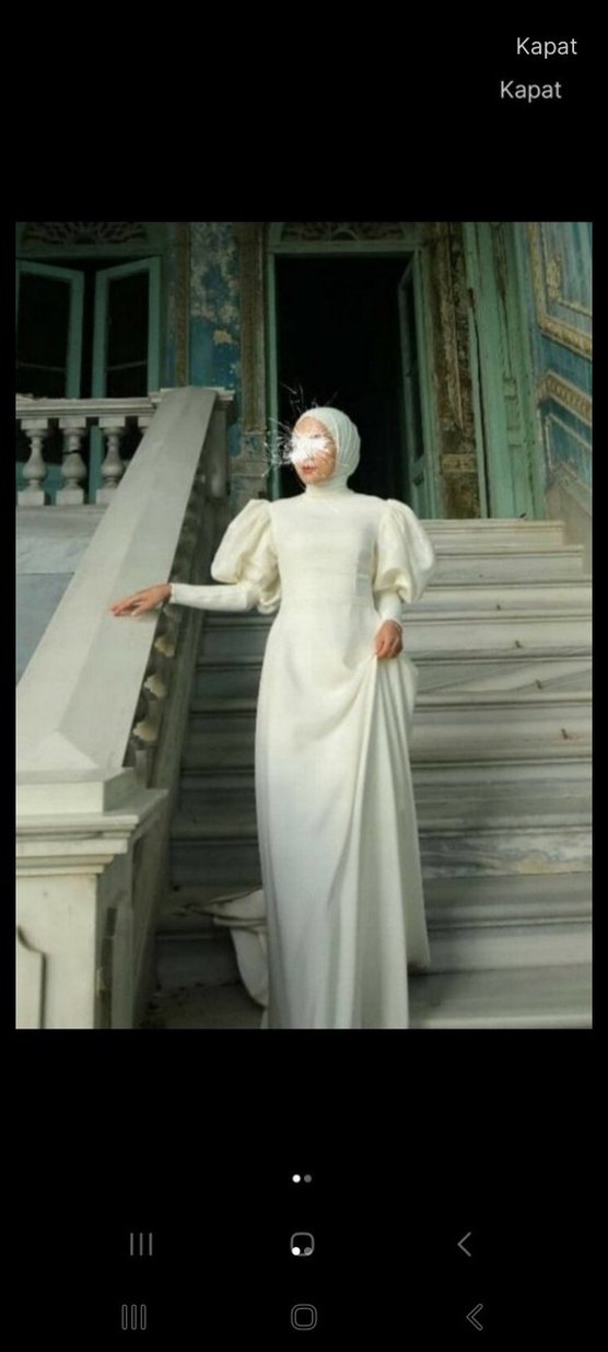Beyaz, drapeli ve uzun kollu olan bu dar kesim gelinlik, yüksek yakasıyla sade ve avangart bir şıklık sunar.