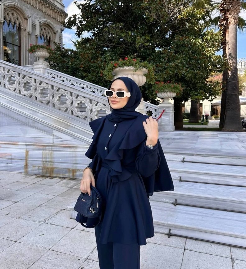 Lacivert renkte, yüksek yakalı, uzun kollu ve etnik desenli drapeli kadın takımı, düzenli kesim ve mütevazı tarzıyla günlük kullanım için uygundur.