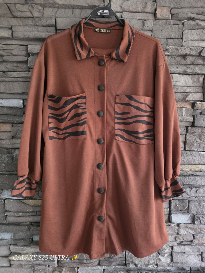 Kahverengi, düğmeli, uzun kollu, zebra desenli cepleri ve yakası olan, rahat kesim kadın takim pantolonu lastikli 42 bedendir xl