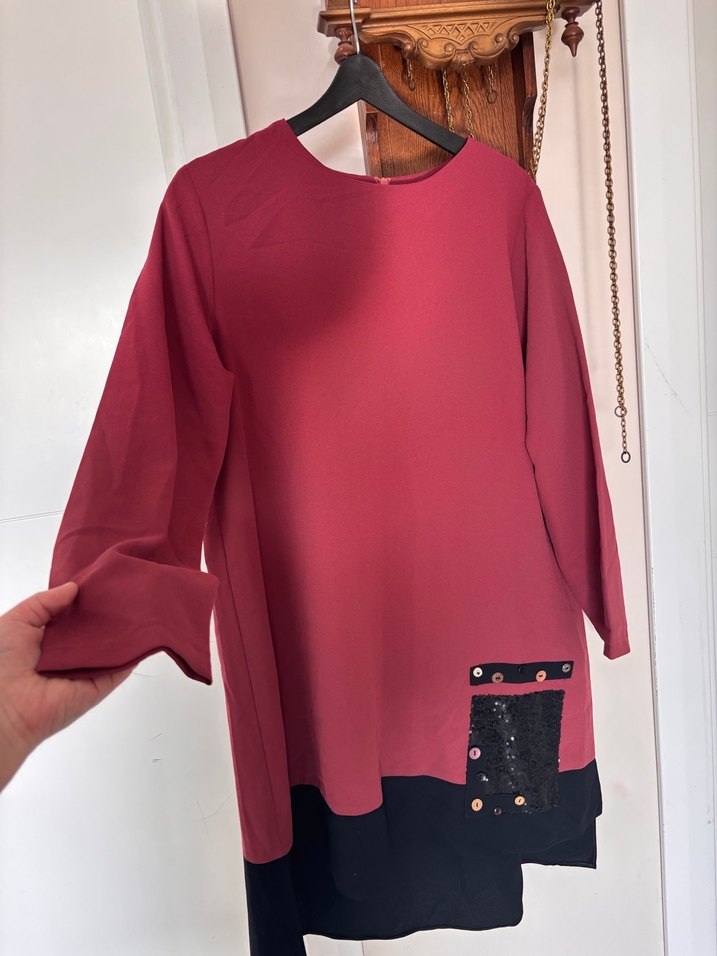 Sadece bir kere giydim yepyeni . Pantolon beli lastıkli. Pantolonun arkasında hafif tüylenme var zaten üstünde tunik olduğu için belli olmuyor yaklaşık 85 kiloda giydim . Tunik önü 85 arkası 95 cm iki göğüs arası 55 cm