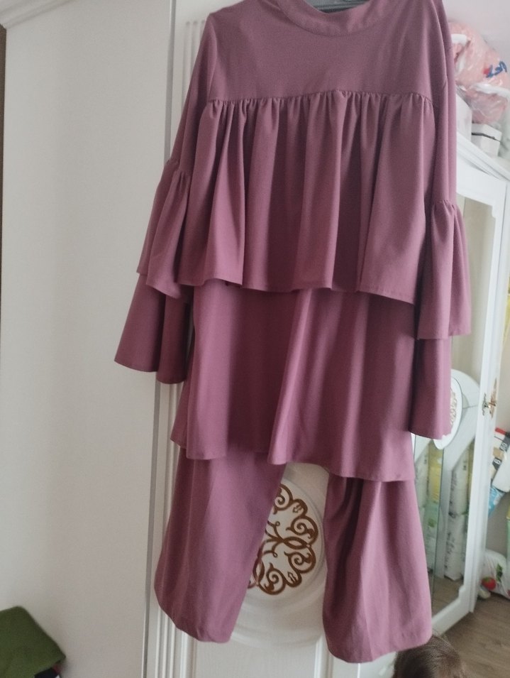 Pastel mor renkte, uzun kollu, salaş kesim, kat kat fırfırlı Yumuşak sentetik kumaştan, rahat ve bohem tarzda.