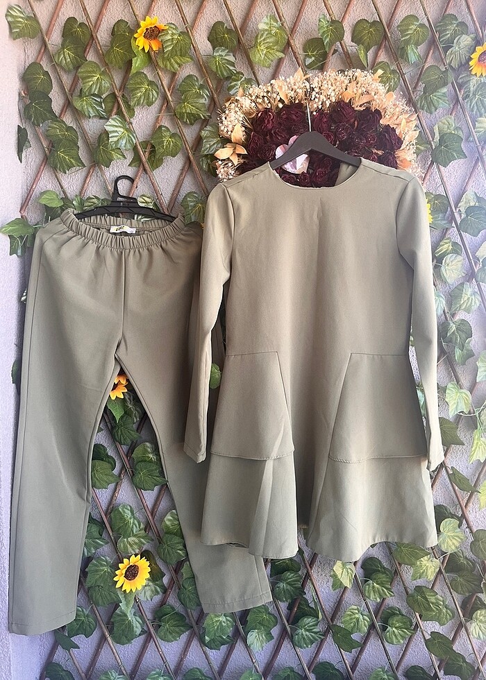 1 beden Krep kumaş Tunik arkadan kısa fermuarlıdır Çekim esnasında ışık sebebiyle rengi biraz açık çıkmış, yakın resimdeki gibi haki renktedir.