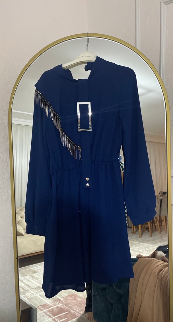 Mavi uzun kadın ceketi, kesik yakalı ve uzun kolludur. Kuşaklı bel ve baskılı detaylara sahiptir. Parlak sentetik kumaştan yapılmış, ofis için uygun trend sokak stili. Çok uyguna koydum sorunsuz 1 kere giydim koyu mavi takım