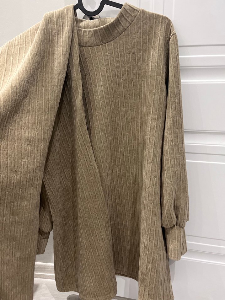 Bej renkte, yüksek yakalı ve pileli uzun rahat kesimlidir, hamileyken 2 kez giydim 40 bedendir. Çokk güzel kışlık bi takım