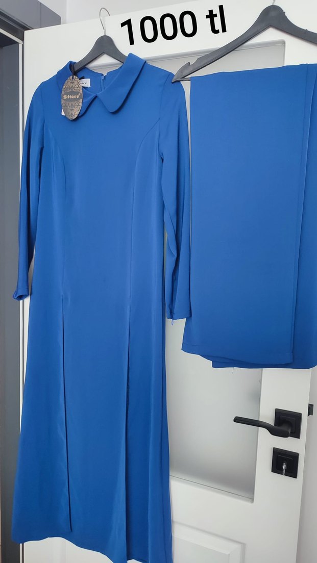 Koyu mavi uzun elbise, uzun kollu ve yuvarlak yakalıdır. İpek gibi kumaştan yapılmış, drapeli ve modern klasik minimal tarzda, ofise uygun rahat kesimlidir. sıfırdir etiketlidir hiç kullanılmadı