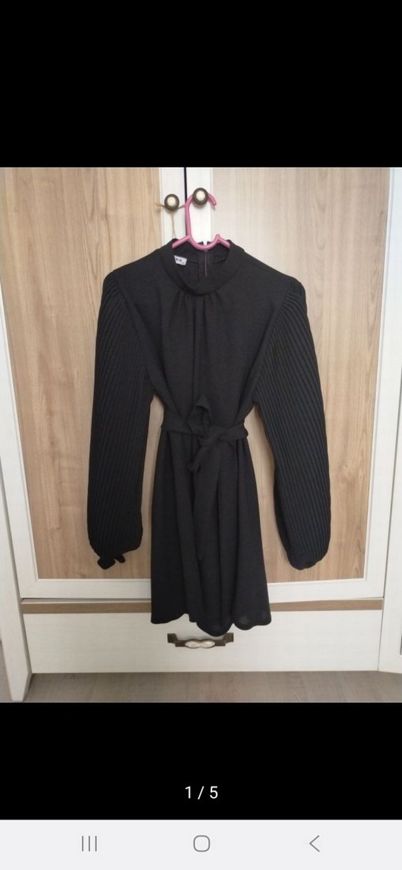 Yüksek yakalı, uzun pilili kollara sahip, vücuda oturan siyah alt üst kadın takım. Yumuşak sentetik kumaştan yapılmış, ofis için uygun gotik Paris tarzı.