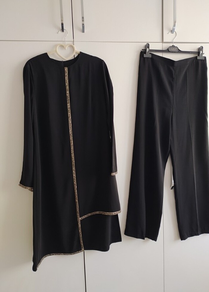 Kol detayında ufak taş yapiskani kalkmasi var onun haricinde hiç bir kusuru yoktur gayet üstte şık duran bir takım pantolon beli lastikli