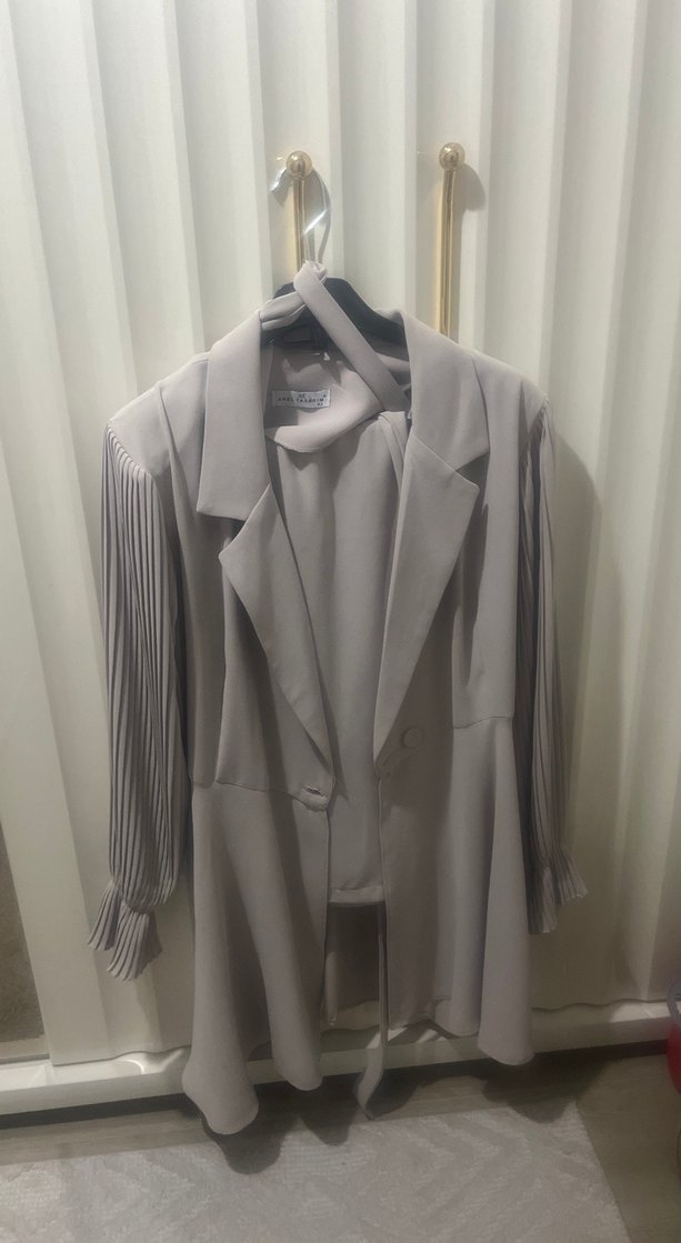 Bej renkli, uzun kesim kadın blazer ceket, pilili uzun kollu ve kesik yaka detaylarına sahiptir. Yumuşak sentetik kumaştan olup, regular fit modeldir.
