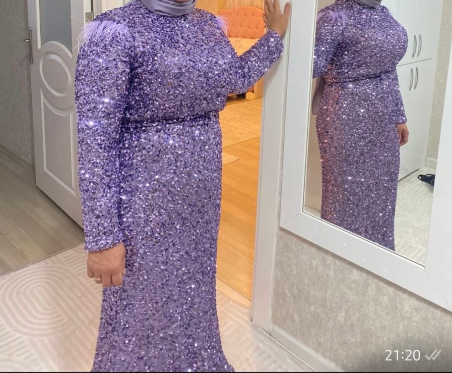 Parlak mor renkli, simli ve yılan desenli, uzun kollu ve yüksek yakalı, vücuda oturan uzun abiye elbise. ✨
