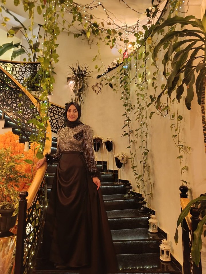 Uzun kollu, yüksek yakalı ve üst kısmı taşlı siyah abiye elbise, drapeli tasarımı ve regular kesimiyle düğünler için uygundur. ✨