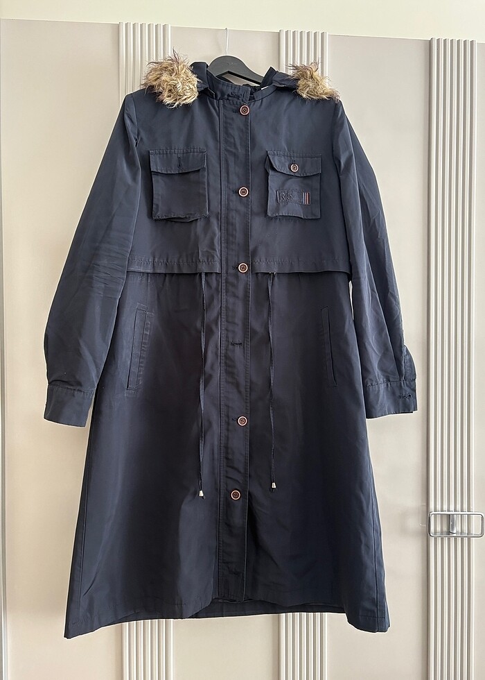 Tuğba venn markasına aittir 46 bedendir boyu 100 cm iki kol arası mesafe 55 cm dir belden sıkmalı olduğu için 44 beden birine de olur kalıbı normaldir iç çıkarılabilir yünlü yeleği vardır kışın soğuklarda o şekilde kullanılabilir çıkarılabilir kapüşonludur