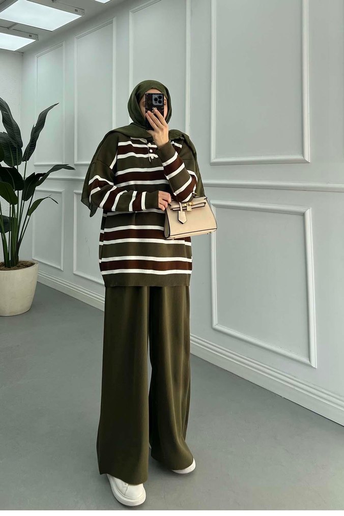 Kadınlar için triko kumaştan yapılmış, haki renkli zebra desenli, midi boyda, bol kesim bir takım. Boğazlı yaka ve uzun kolludur, rahat ve şık sokak stilini yansıtır. Sıfırdır etiketi üstündedir 36-44 beden arası uyumludur