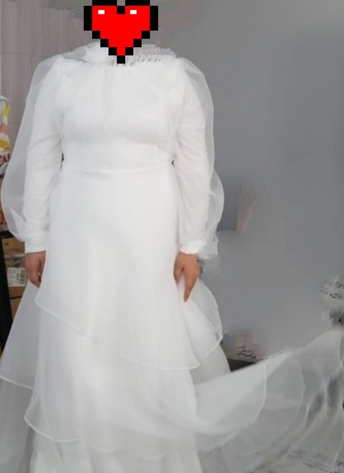 Bu beyaz gelinlik, yüksek yakalı ve uzun kollu vintage tarzıyla dikkat çeker. A kesim ve katmanlı etek ucu ile mütevazı bir görünüm sunar.