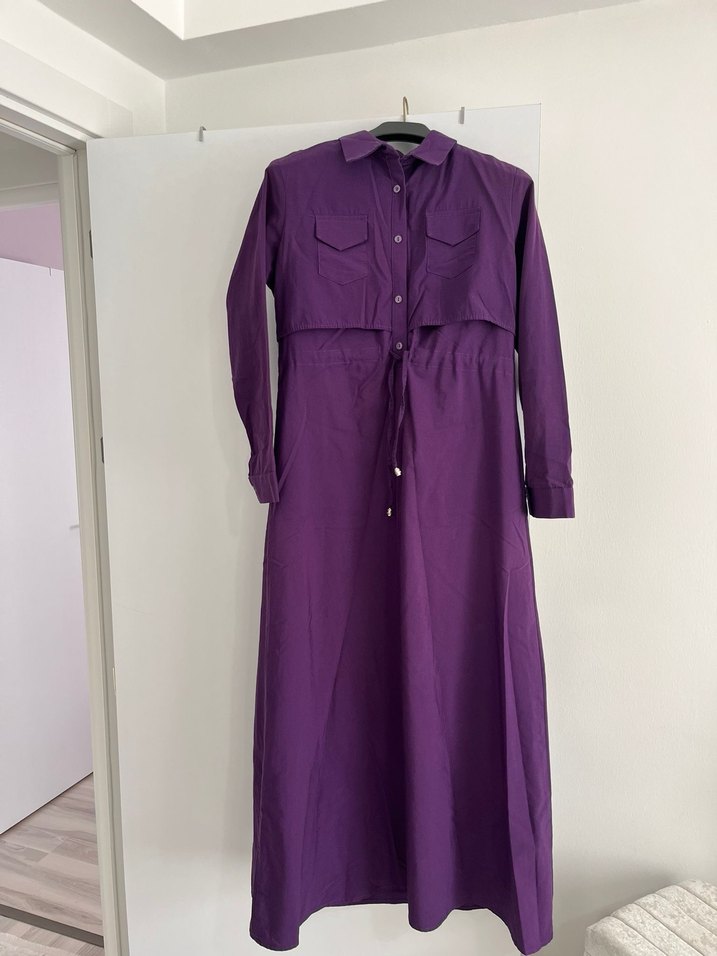 Mor renkte, düğmeli, yakalı ve uzun kollu uzun elbisedir. Sentetik kumaştan, sade ve günlük kullanım için uygundur.