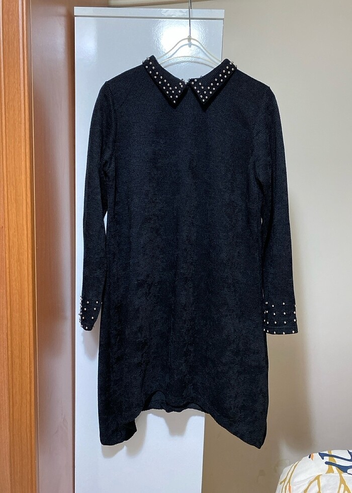 Ürün hiç giyilmedi sadece etiketi yok ve yıkandı L beden 38-42 arasına uyumlu uzunluk 85 cm kumaşı kadife türünde bir kumaşı var etek ucu asimetrik kesimlidir enseden bir adet düğmesi mevcut