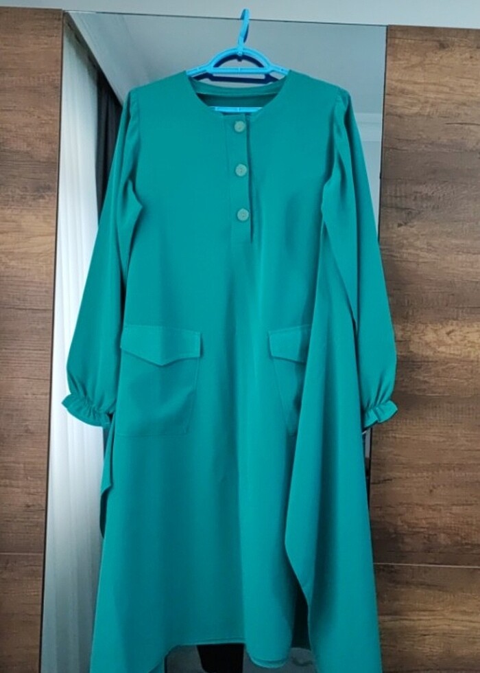 Turkuazın daha yeşilimsi bir tonu olan renkte, premium yazlık krep kumaş özel dikim tunik. 38-40-42 beden uyumlu. Gebelikte kullanmıştım. Son fotoğrafta sol kolunda bir iz oluşmuş onu gösterdim, nasıl geçer bilmiyorum.