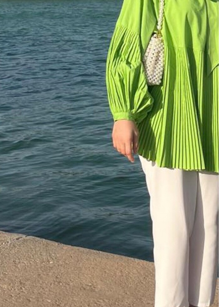 Tertemiz 1 kez tek giyildi standart beden geniş salaş Fıstık yeşili renk Sarı renkteki gibi modeli aynıdır önden bağlamalı Arkadaşlar gömleğin boğaz kısmasında minicik bir kusuru var (minik bir delik)zaten kapalı bayansanız şal bağlanınca asla görünmüyor 400 liradan aşağı vermiyorum arkadaşlar 400 liradan aşağı teklif göndermeyin boşuna