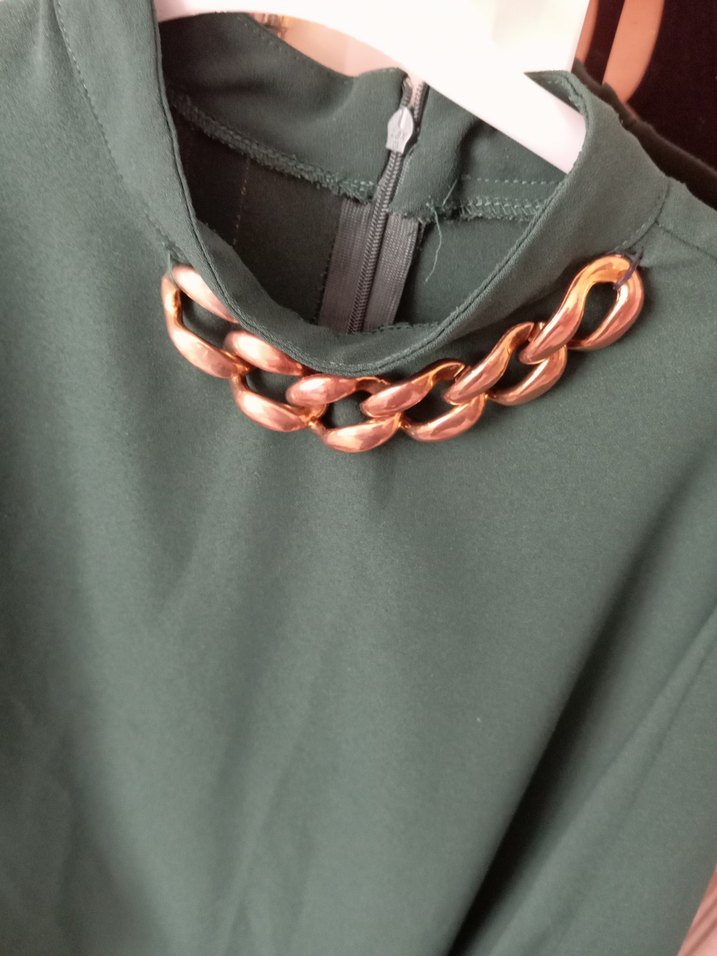 Parlak yeşil renkte, zincir detaylı balon kol tunik tesettür markası belirsiz