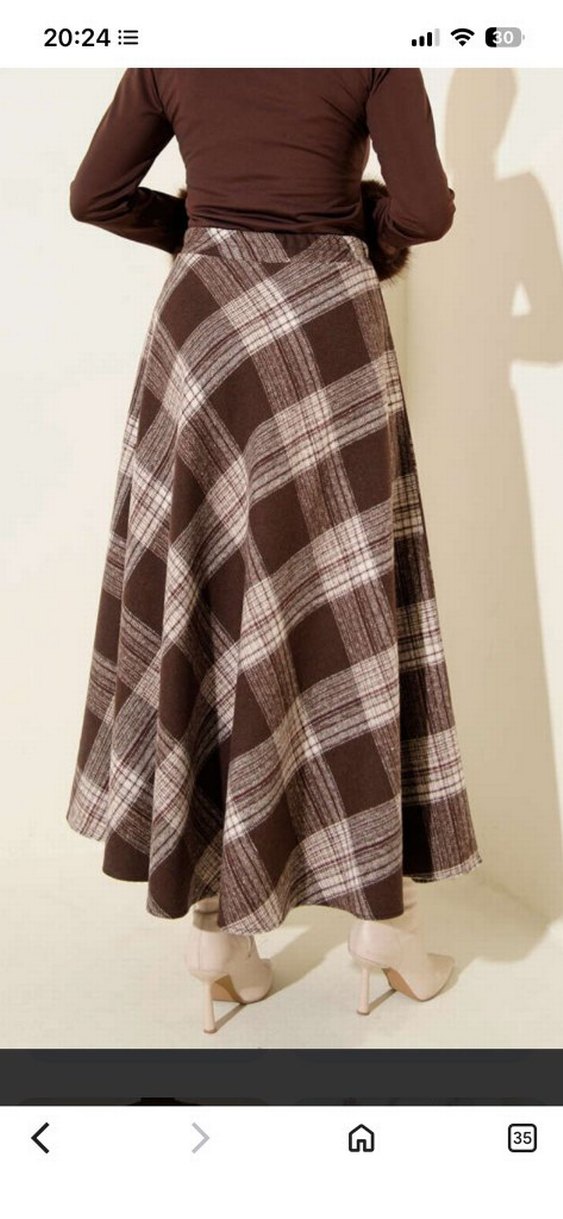 Yumuşak ve sıcak kumaştan, kahverengi ekose desenli, bol kesim ve drapeli uzun etek. Günlük kullanıma uygun klasik tarzda.