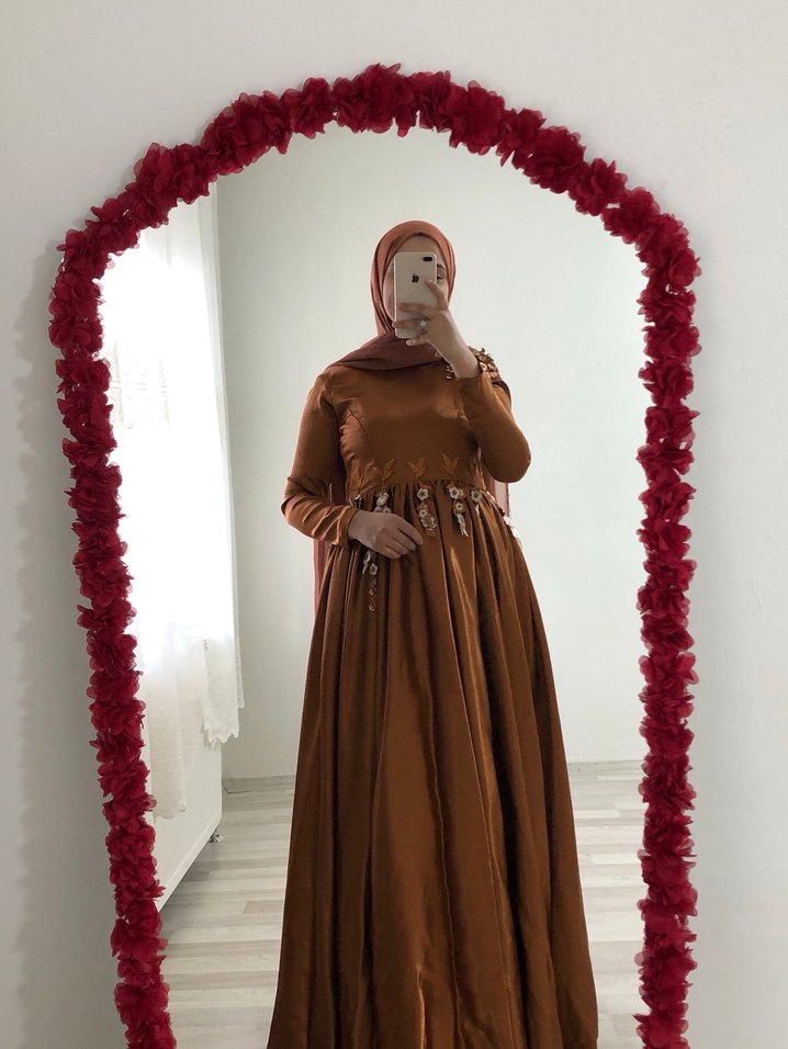 Uzun, bol kesim kiremit rengi abiye, yüksek yakalı ve uzun kollu, 2 metre şalı vardır. Özel dikimdir 36,38 beden uyumludur