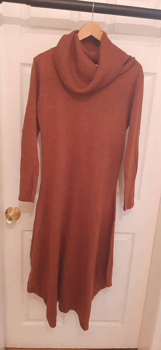 Kiremit renginde triko elbise, yumuşak yün kumaştan, uzun kollu ve drapeli yüksek yakalıdır. Bol kesim ve uzun boydadır, günlük kullanıma uygundur. Boyu: 123cm Göğüs izası eni: 44cm