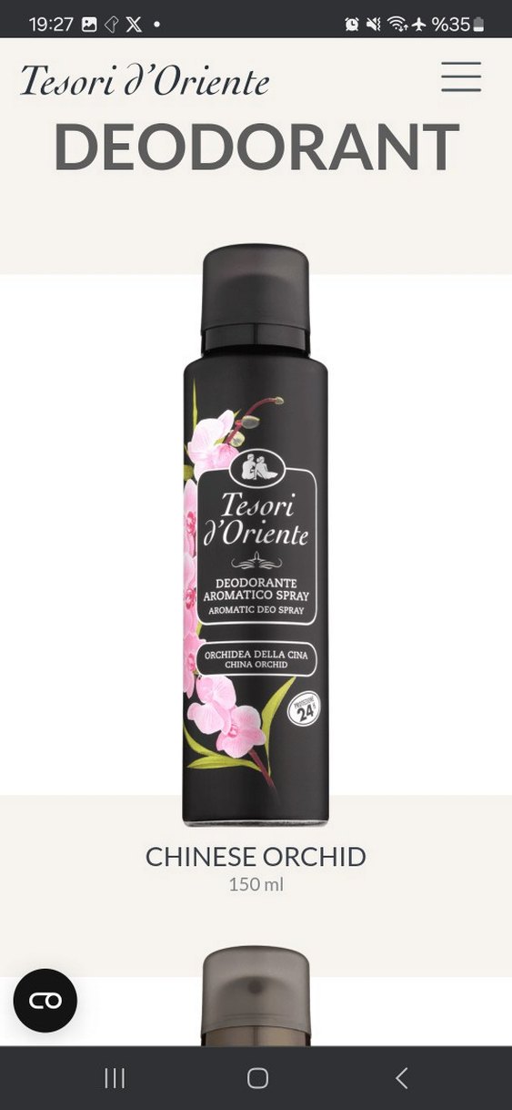 Tesori d'Oriente Çin Orkidesi aromatik deodorant spreyi, 24 saat kalıcı tazelik ve ferah çiçeksi koku sunar. 150 ml şişede uzun süreli koruma sağlar.