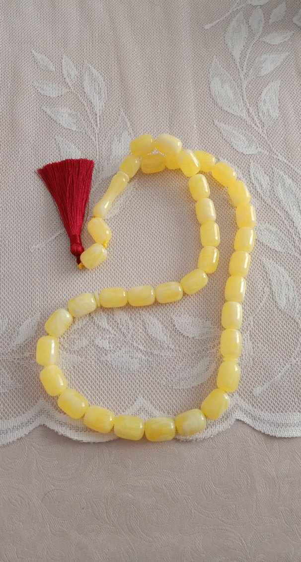 Klasik tasarımlı, açık sarı renkte vintage erkek tesbih. Kırmızı püskülü ile dikkat çeker. Çok güzel kaçırmayın