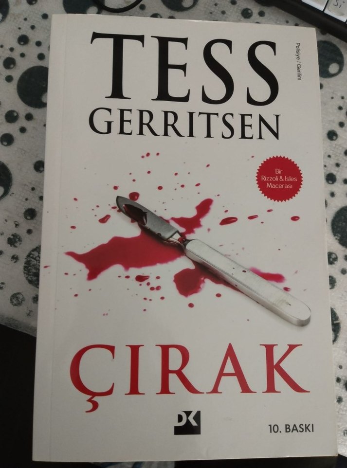 Tess Gerritsen'in "Çırak" adlı romanı, 10. baskı olup, kan izli bistüri görselli kapak tasarımına sahiptir. ️♂️