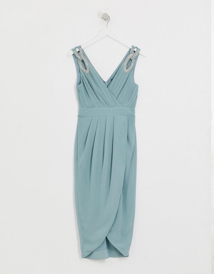 Drapeli ve taş detaylı, V yakalı, kolsuz, su yeşili pastel renkli, uzun ve vücuda oturan abiye elbise, davet ve özel günler için uygundur, %100 polyester, Lütfen verilen boyutları kontrol edin. BOYUTLAR: Omuzdan itibaren uzunluk - 115cm, Koltuk altı genişligi - 40 ila en fazla 45 cm x2 Bel genişligi - 33 ila en fazla 36 cm x2 Kalça genişligi - 47 cm x 2'den itibaren