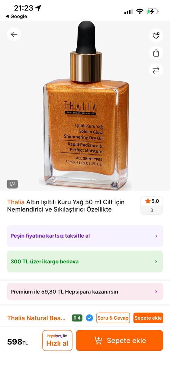 Thalia Altın Işıltılı Kuru Yağ, tüm cilt tipleri için hızlı parlaklık, mükemmel nem ve sıkılaştırıcı özellikler sunar. 50 ml şişede. ✨
