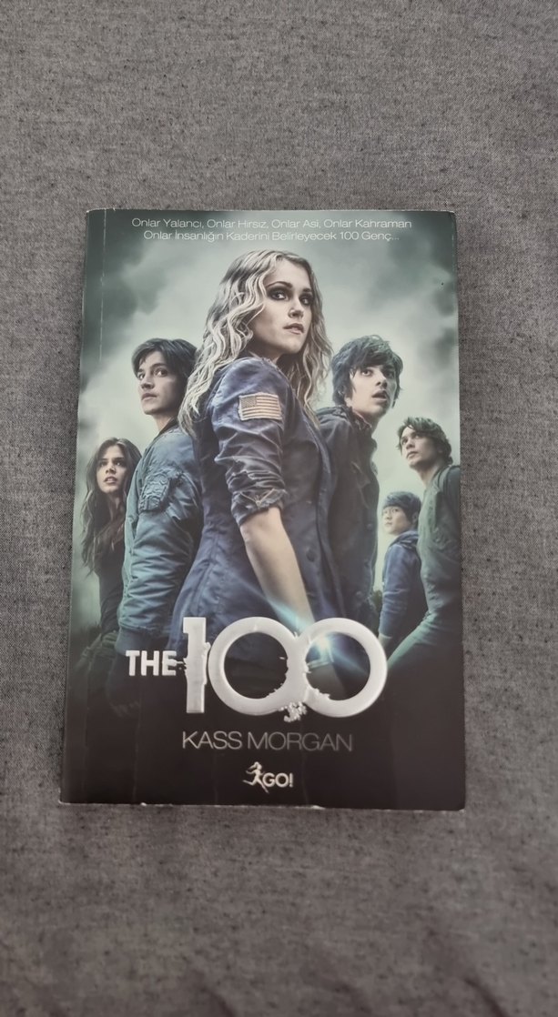 Kass Morgan'ın The 100 adlı kitabı, zorlu bir ortamda hayatta kalmaya çalışan gençleri konu alıyor. Kapakta ana karakterler ve karanlık bir gökyüzü yer alıyor.
