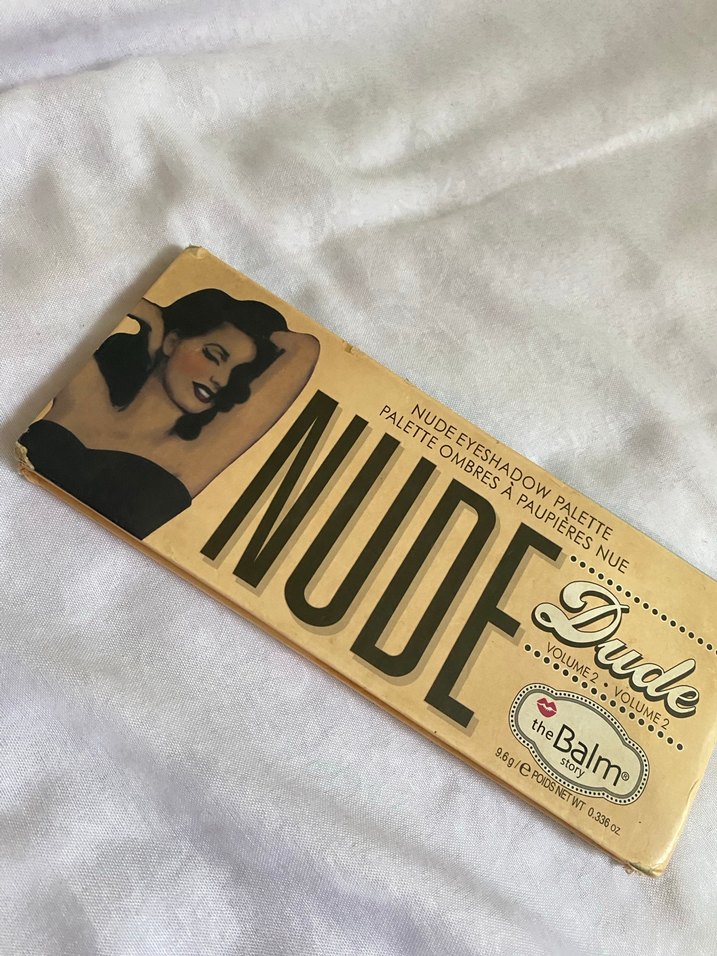 Bej tonlarında, parlak nude göz farı paleti. "NUDI" yazılı, theBalm markasına ait kompakt kutuda. Göründüğü gibi