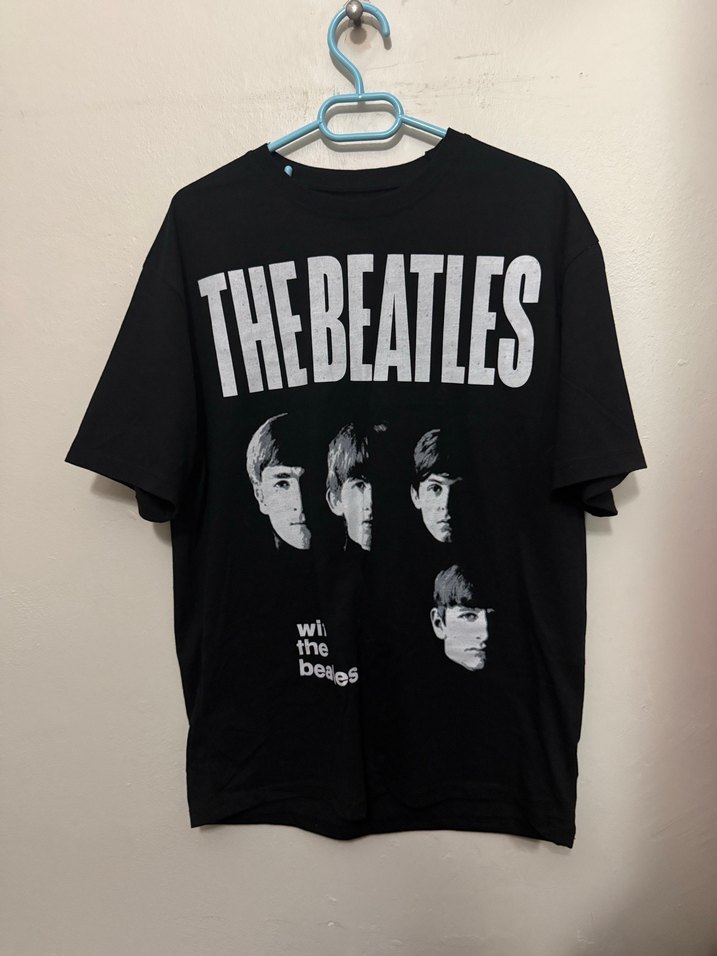 The Beatles baskılı, düğmeli detaylı, siyah renkli, kısa kollu, bisiklet yaka, bol kesim erkek tişörtü.