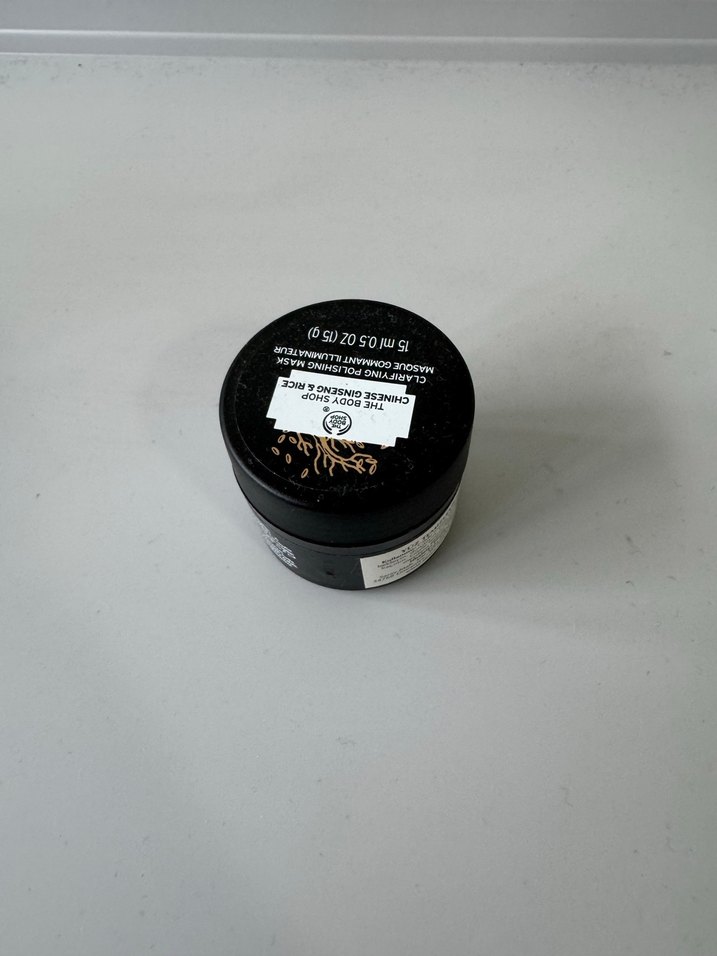The Body Shop Chinese Ginseng & Rice arındırıcı ve aydınlatıcı maske, 15 ml boyutunda. Ciltteki toksinleri temizleyip ferah bir his bırakır. Ürün hiç açılmamış ve sıfır durumdadır.