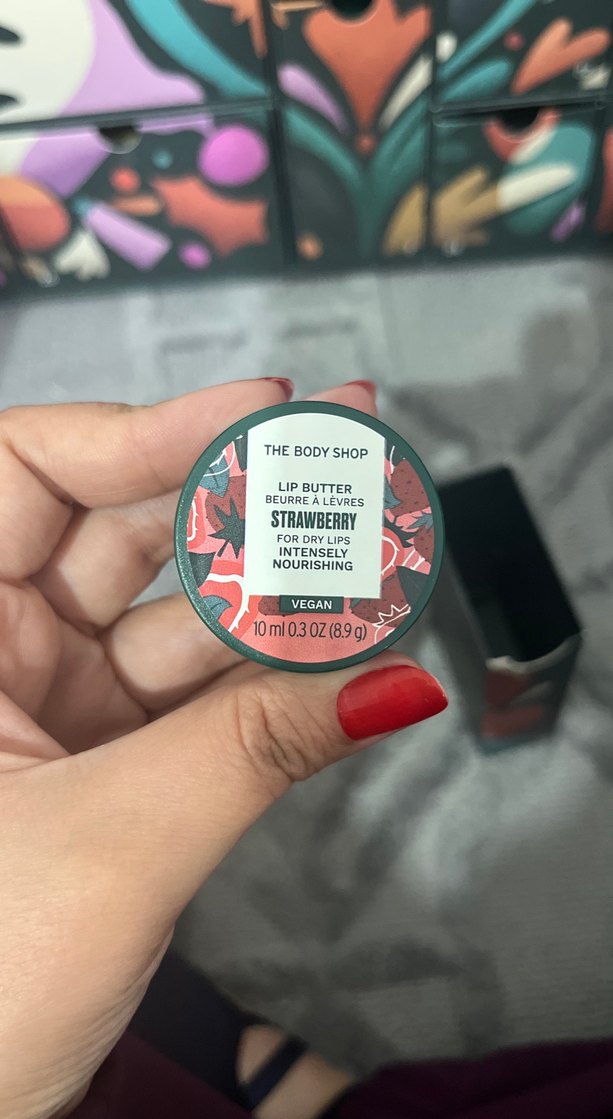 The Body Shop Çilekli Dudak Balmı, kuru dudaklar için yoğun besleyici vegan formülde. 10 ml boyutunda, parlak kırmızı tonlu.