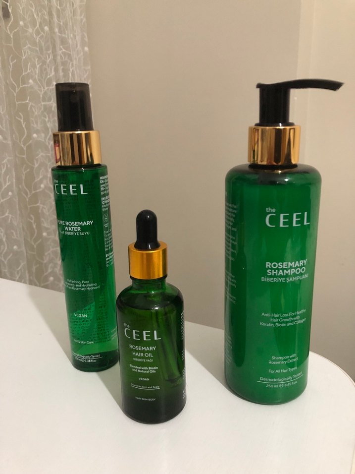 The CEEL saç bakım seti; biberiye şampuanı, saç yağı ve su içerir. Saç büyümesini destekler, saçları güçlendirir.