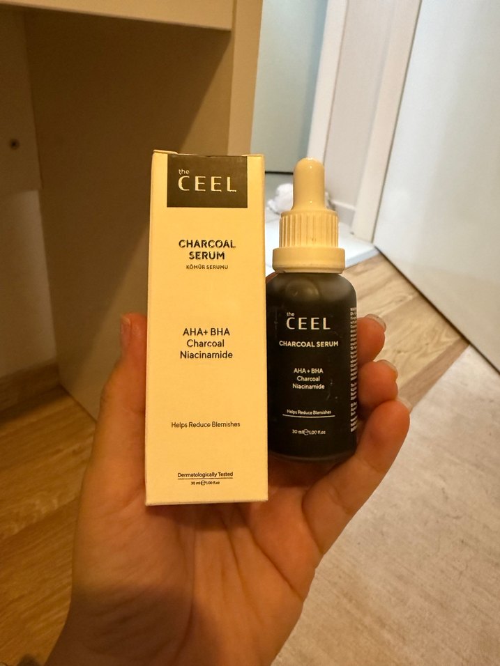The CEEL Charcoal Serum, AHA, BHA, kömür ve niasinamid içerir, cilt lekelerini azaltmaya yardımcı olur. Dermatolojik olarak test edilmiştir.