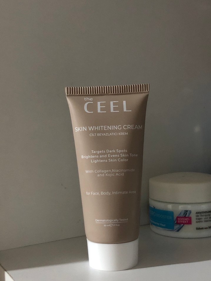 The CEEL Cilt Beyazlatıcı Krem, koyu lekeleri hedefler, cilt tonunu eşitler ve açıcı etkisi vardır. Kolajen, niasinamid ve kojik asit içerir.