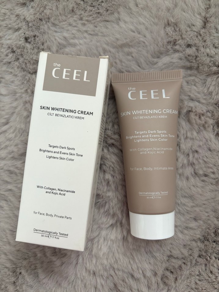 The CEEL cilt beyazlatıcı krem, koyu lekeleri hedefler, cilt tonunu aydınlatır ve eşitler. Kolajen, niasinamid ve kojik asit içerir. Yüz, vücut ve özel bölgeler için uygundur. Dermatolojik olarak test edilmiştir nohut tanesi kadar kullandım içi full doludur.