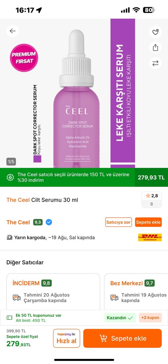 The Ceel Leke Karşıtı Cilt Serumu, Alpha Arbutin 2%, Hyaluronik Asit ve Niasinamid içerir, koyu lekeleri azaltır ve cilt tonunu eşitler. 30 ml şişede.